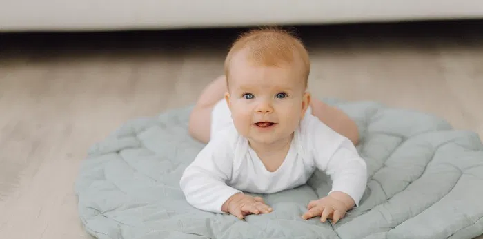 Sebagian bayi berusia 4 bulan juga mulai melakukan mini push-up, mengangkat kepala dan dada dengan mendorong lantai menggunakan lengan.